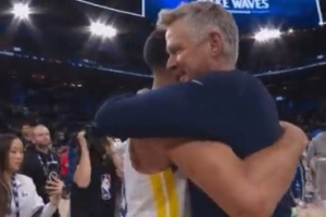 金牌师徒!赛后库里和科尔紧紧拥抱 随后和快船队员拥抱致意