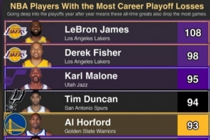 奥尼尔转发季后赛输球榜:詹姆斯108负第1 霍福德93负第5 OK前10