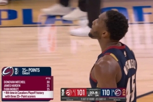 骑士季后赛队史第4次单场三人得分25+!米切尔30分最高