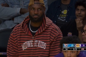 高挂免战牌!詹姆斯来到场边观战 本场因脚伤缺席