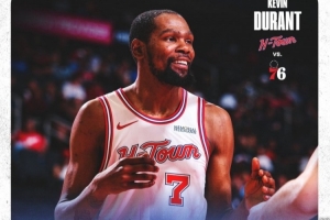 轰下全场最高29分外加7板5助!火箭晒杜兰特数据海报 KD面带笑意