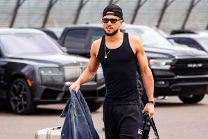 太阳众将登机照:布克背心+黑超+项链硬汉风 狄龙卫衣现灰熊logo