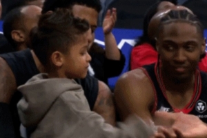 亲自时刻!末节乔治带儿子在替补席 乔治儿子跟马克西等队友互动